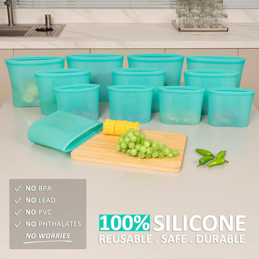 12 Pack Silicone Food Storage Bags Aqua Stand Up Zip Lock