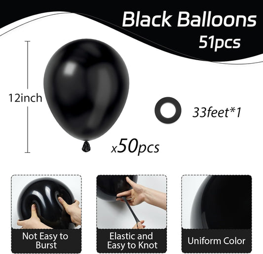 Black Latex Balloons 50 Pack 12 Inch With Ribbon For Party