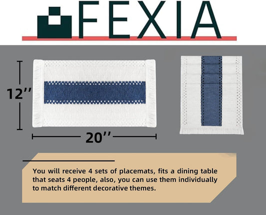 Blue Boho Placemats Set of 4, Macrame Table Decor and Farmhouse Style Placemats Natural Cotton Burlap, for Dining Table, Blue