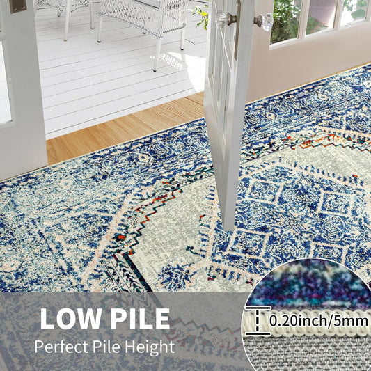 Boho Area Rug 2X3 Washable Entryway Rugs Front Door Mat Indoor Entrance Non-Slip Vintage Distressed Small Entry Rug for Living Room Kitchen Bathroom Office Lightweight Carpet, Blue Cream