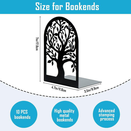 Book Ends, Metal Bookends for Shelves, Modern Tree Book Ends Decorative, Heavy Duty Book Holders Book Stoppers for Home Office Decor, 6.9"X4.7"X3.5" (5 Pairs/10 Pcs)