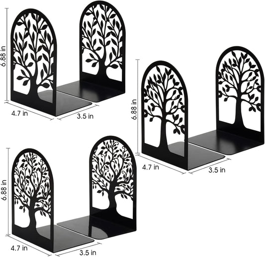 Book Ends, Metal Book Ends to Hold Books, Tree Decorative Bookends for Shelves, Black Book Stopper Bookend for Heavy Books, Book Holder for Shelf Home Office, 6.8 X 4.7 X 3.5(3 Pair/6 Pcs)