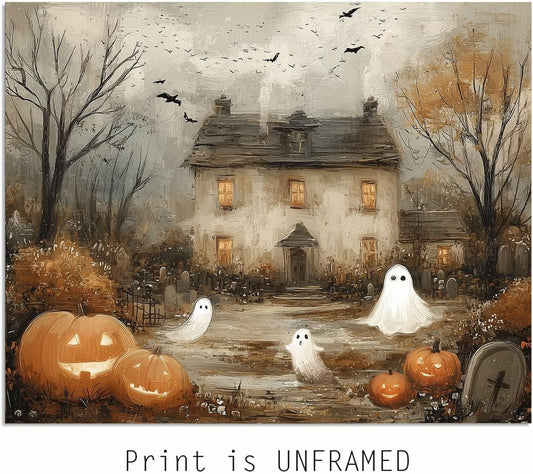 Cute Ghosts Haunted Halloween Wall Art, Farmhouse Wall Decor, Spooky Pumpkin Patch Painting Print, Vintage Country Cottage Fall Decor, Halloween Poster, Unframed (11 X 14 Inch)
