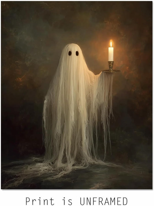 Cute Ghost Holding Candle Wall Art Print Dark Academia Room Decor Spooky Halloween Ghost Art Moody Halloween Wall Art Vintage Gothic Ghost Portrait Unframed (11X14 Inch)