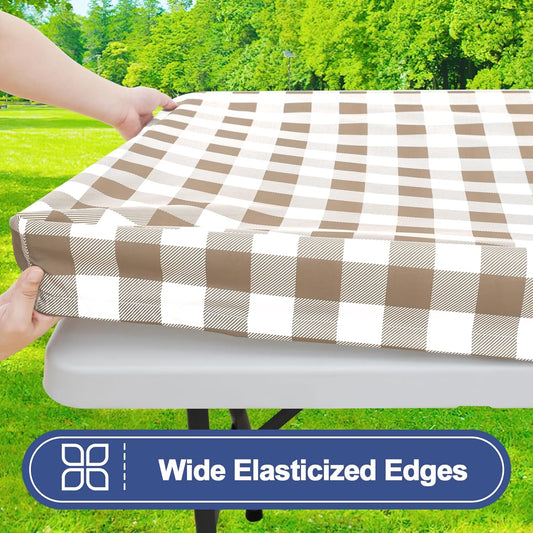 Waterproof Elastic Fitted Tablecloths for 6FT Rectangle Tables - 2 Pack, Washable Polyester Buffalo Plaid Design for Camping, Dining & Outdoor Use (Khaki & White, 30" X 72")