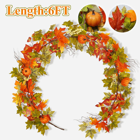 Fall Leaves Garland for Mantle, 6Ft Greenery Leaf Garland with Pumpkins and Fall Eucalyptus for Table,Mantle,Fireplace,Autumn and Thanksgiving Decor