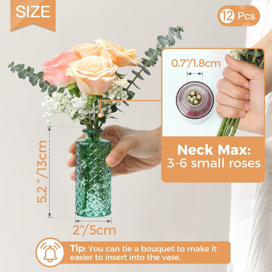 Glass Bud Vases Set of 12, Small Diamond Bud Vases in Bulk, Mini Flowers Vases for Centerpieces, Vintage Decor Centerpiece for Table, Wedding Recepetion, Home, Gift (Green)
