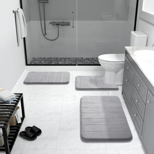 Memory Foam Bath Mat Set 3 Pieces- Super Soft Absorbent Quick Dry Bathroom Rug Sets, Machine Washable Non Slip Floor Carpet for Tub Shower, Vanity & Toilet Base, Gray