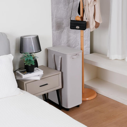 Slim Laundry Hamper with Lid and Wheels, Small Rolling Laundry Basket with Handle for Small Spaces, Tall Dirty Clothes Hampers for Dorm, Bathroom and Bedroom, 75L, Beige