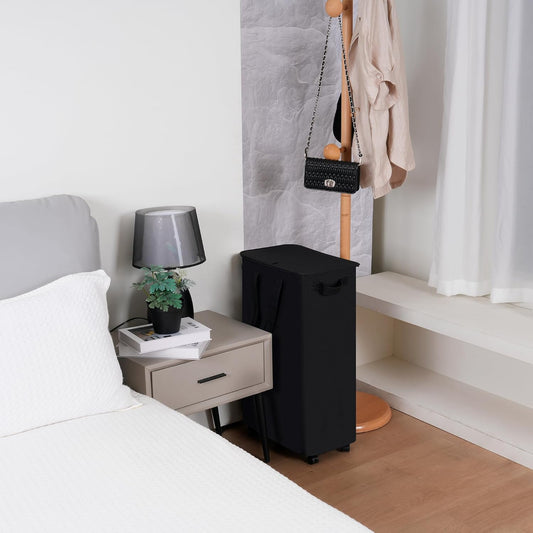 Slim Laundry Hamper with Lid and Wheels, Small Rolling Laundry Basket with Handle for Small Spaces, Tall Dirty Clothes Hampers for Dorm, Bathroom and Bedroom, 75L Black