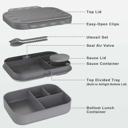 Stackable Bento Lunch Box for Adults and Teens - Durable Leak-Proof 4-Compartment Container with Utensils and Sauce Container, BPA-Free, Dishwasher and Microwave Safe, 47 Oz (Dark Gray)