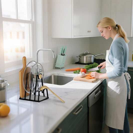 Multifunctional Kitchen Counter Organizer with Fast-Drying Stone and Stainless Steel Pot Lid Holder, Black