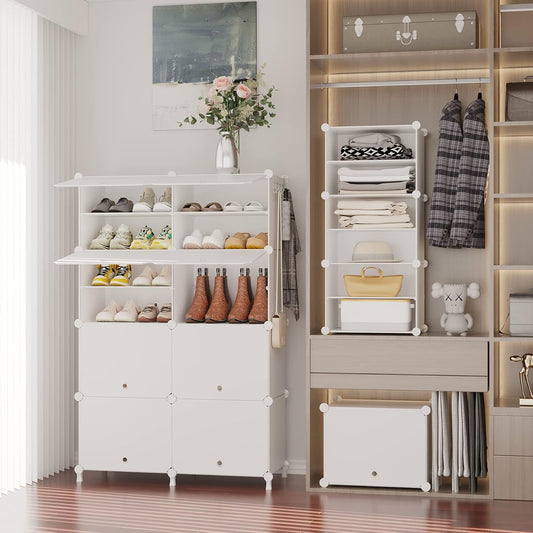 Shoe Rack, 8 Tier Shoe Storage Cabinet with Door, 32 Pair Shoe Organizer Shelves for Closet Hallway Bedroom Entryway, White