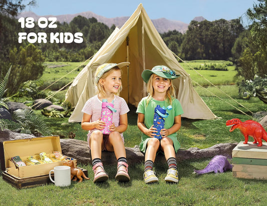 18 Oz Stainless Steel Insulated Water Bottle with Flip Straw and Handle, Leak-Proof Design, Cup Holder Compatible, Reusable for Travel, Gym, and School (Dinosaur)