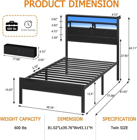 Twin Bed Frame with Integrated Charging Station and LED Lighting, Wooden Headboard Featuring Two Fabric Drawers and Storage Shelves, Twin Size Platform Design with Metal Slats, Box Spring Not Required, Black Oak Finish