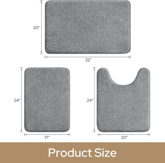 Upgraded Bathroom Rugs Sets 3 Piece, Extra Thick Absorbent Soft Memory Foam, Washable Toilet Bath Mat (Grey,17"X24"+20"X32"+U Shape 20"X24")