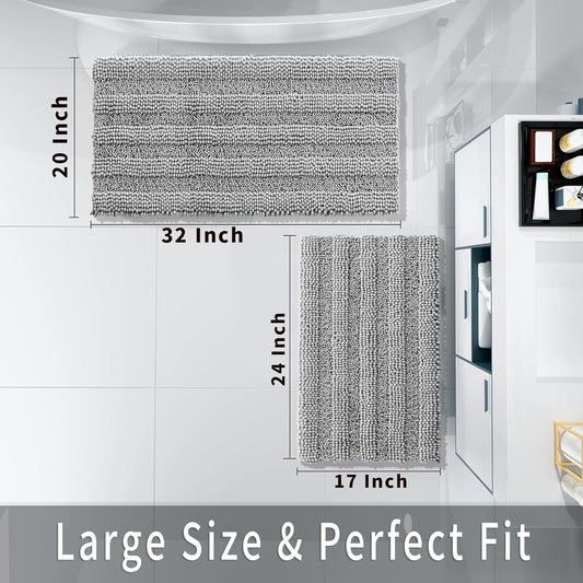 Washable Bathroom Rugs Sets 2 Piece, Non Slip Quick Dry Absorbent Bath Mat Set, Plush Chenille Luxury Shower Rugs for Bathroom Floor Sink Tub and Shower Outside(Gray, 20" X 32"+17" X 24")