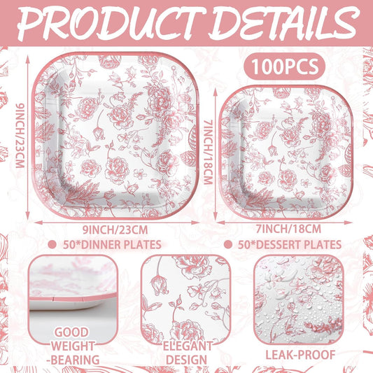 100-Piece Floral Disposable Paper Plate Set - 9-Inch Dinner Plates and 7-Inch Square Dessert Plates for Birthday, Wedding, and Baby Shower Celebrations (Pink, Floral Design)