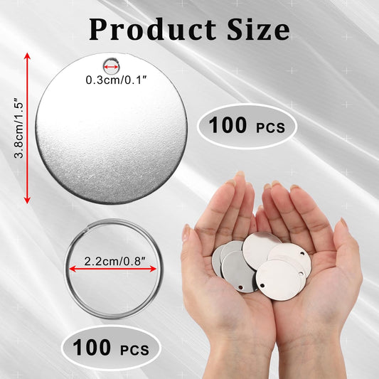 100-Piece Set of 1.5-Inch Round Stainless Steel Metal Stamping Blanks with Holes and Key Rings for Jewelry Making, Personalized DIY Crafts, and Pet ID Tags