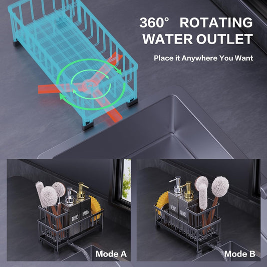 Kitchen Soap Dispenser Set with Sink Caddy, 12 Oz Glass Bottle, Hand and Dish Soap Dispenser Set with Sponge Holder (Black Sink Caddy + Black Bottle)