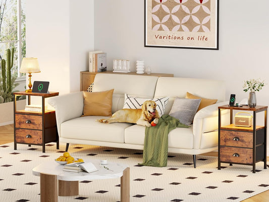 Nightstands Set of 2 Charging Station, End Tables with LED Lights, Nightstands with 2 Fabric Drawers and Shelves, Bedside Tables for Living Room/Bedroom,Rustic Brown