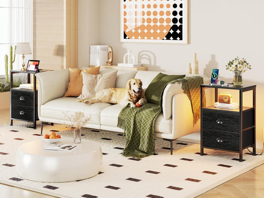 Nightstands Set of 2, End Tables with Charging Station and LED Lights, Black Night Stands with 2 Fabric Drawers, Bedside Tables Set of 2 for Living Room/Bedroom,Black Oak