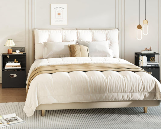 Nightstand with Charging Station, Black Night Stand with 2 Fabric Drawers, Side Table with USB Ports, End Table with Storage Shelf, for Living Room/Bedroom, Black Oak
