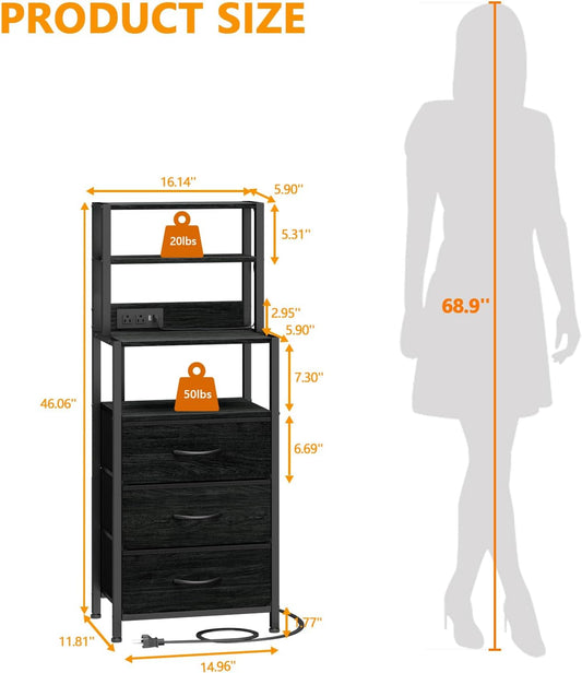 Tall Nightstand with 4-Tier Shelves, 3 Fabric Drawers, LED Charging Station, Black Oak Bedside Table for Bedroom, Hallway, and Home Office