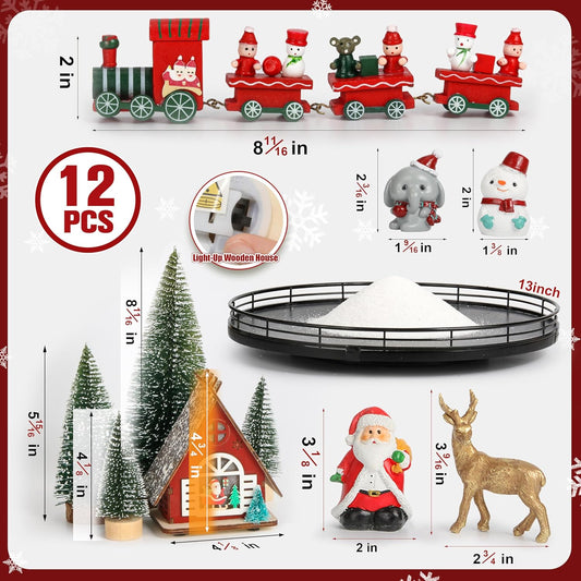 12 Pcs Oak Wooden Lazy Susan - Winter Table Top Decor Set with Christmas Ornaments, Santa, Trees, Snowman Holiday Centerpieces