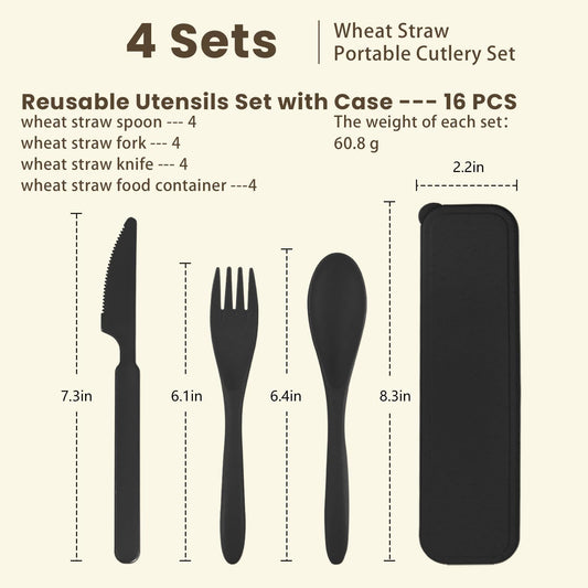 Premium Reusable Travel Utensils Set with Case - 4-Piece Wheat Straw Portable Cutlery for Work, Camping, Picnics, and School (Black)
