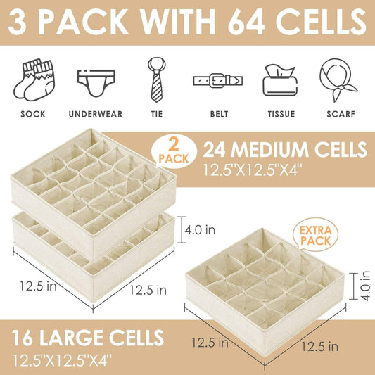 3 Pack Sock Underwear Drawer Organizer Dividers, 64 Cell Fabric Foldable Cabinet Dresser Closet Organizers and Storage Boxes for Organizing Socks, Underwear, Ties (16+24+24 Cell, Beige)Vendor:BodPeaceRegular price $49.99 USDRegular priceUnit price / per$0.00 USDSale price $49.99 USD