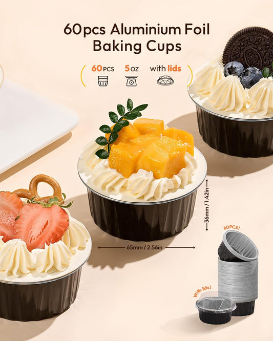 60 Pack 5Oz Disposable Aluminum Foil Ramekins with Lids, Mini round Baking Cups, Muffin Tins for Creme Brulee, Souffle, Pudding, Non-Stick, Wedding Favors, Black