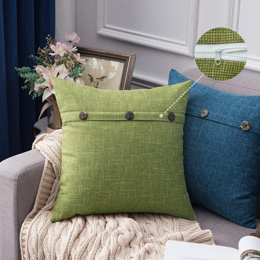 Set of 2 Decorative Linen Pillow Covers Farmhouse Vintage with Triple Button Accent Pillows for Couch Sofa Bed Living Room Home Decor 18X18 Inch Green