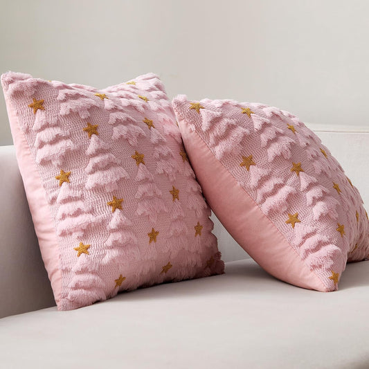 Christmas Pillow Covers 18X18 Inch Set of 2, Pink Christmas Tree Plush Faux Fur Pillowcases Soft Decorative Throw Pillow Cases for Couch Sofa Living Room Winter Xmas Holiday Home Decor