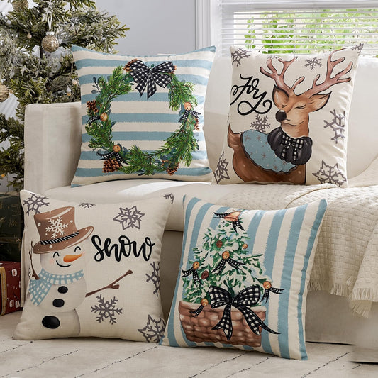 Set of 4 Holiday Blue Decorative Pillow Covers 16X16 Inch Snowman Elk Merry Christmas Throw Pillow Cases Winter Seasonal Cushion Cases Home Decors for Sofa Couch Bedroom