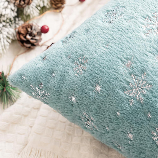 Set of 2 Christmas Decorative Throw Pillow Covers Soft Faux Fur Winter Pillow Covers with Silver Snowflake Glitter Holiday Festival Pillowcases for Couch Sofa Bed, 18×18Inch, Aqua Green