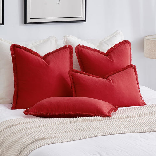 Throw Pillow Covers Boho Farmhouse 24X24 Christmas Set of 2 Decorative Christmas Red Eruo Sham Couch with Fringe Chic Cotton Pillowcases Home Decor Accents for Cushion Soft Bed Living Room