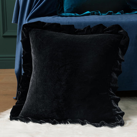 Velvet Ruffle Throw Pillow Covers Soft Luxurious Black Pack of 2 18X18 Inch Square Cushions Vintage Gothic Decorative Ruffled Pillow Shams for Sofa Couch Bedroom Chair