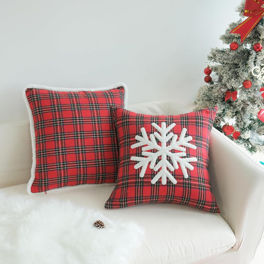 Pack of 2 Christmas Throw Pillow Covers Plaid Scottish Tartan Cushion Case Snowflake Embroideried Pillowcases for Sofa Couch Bedroom (Red, 20 X 20-Inch)