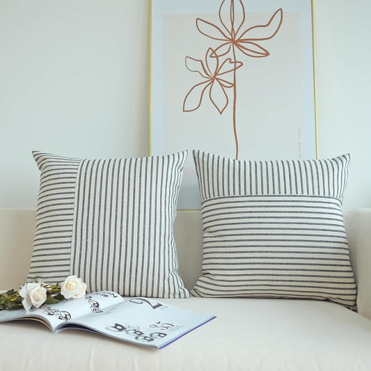 Black and Beige Patchwork Farmhouse Pillow Covers 20X20 Inch, Pack of 2 Striped Linen Decorative Modern Accent Pillow Cases for Sofa Couch Bedroom 20 X 20