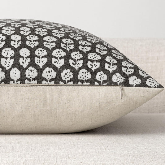 Set of 2 Vintage Floral Block Print Pillow Covers, 18x18 Inch Neutral Linen Farmhouse Cushion Cases for Couch, Sofa, Bed, and Chair in Black