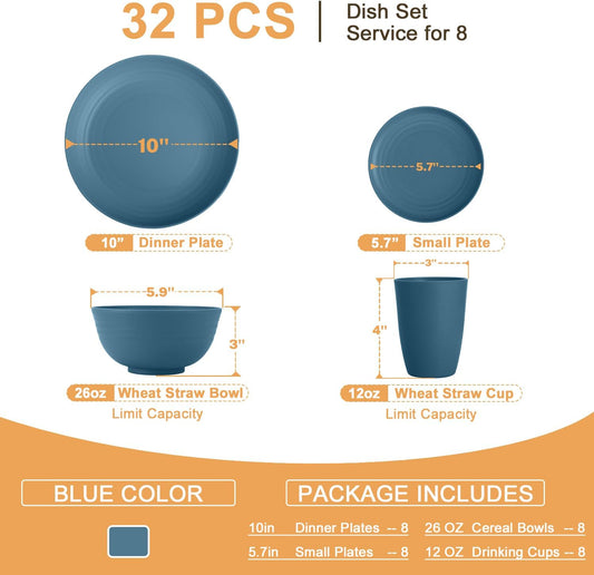 Premium Wheat Straw Dinnerware Set - Complete with Dinner Plates, Dessert Plates, Cereal Bowls, and Drinking Glasses - Microwave and Dishwasher Safe - Perfect for Camping - Blue