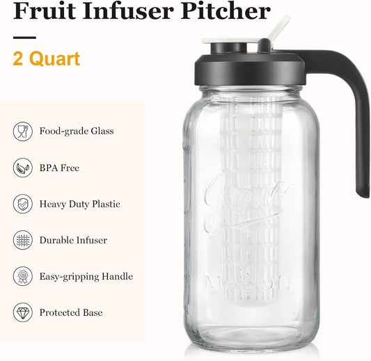 Heavy Duty Mason Jar Fruit Infuser Water Pitcher, Leak-Proof Glass Pitcher with Filter Lid, Wide Mouth Glass Jar - 2 Quart