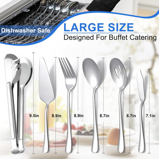 Serving Utensils, Set of 6 Large Serving Spoons Forks Tongs Butter Knife and Pie Server, Thickened Stainless Steel Buffet Catering Flatware Serving Set for Party Banquet