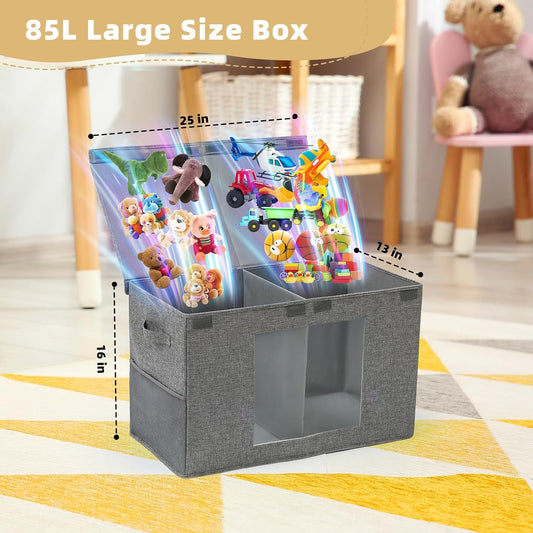 Clear Window Toy Box & Toy Chest with Lid - Large Toy Storage Organizer, Collapsibletoy Bin with Mesh Pockets for Boys, Girls, Playroom,Living Room Area Organization 25"X13" X16" (Linen Gray)