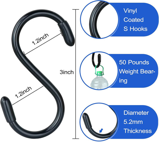 3-Inch Vinyl Coated S Hooks - 10 Pack Heavy Duty Non-Slip S Hooks for Hanging Plants, Jewelry, Pots, Pans, Towels, and More - Small Rubber Coated Steel Design in Black