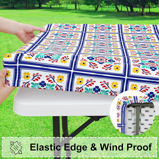 Rectangle Vinyl Tablecloth, Fitted Table Cover, 100% Waterproof, Elastic Edge, Flannel Backing, Table Cloth Fit 4 Foot Folding Tables for Picnic, Outdoor (Geometric Flower, 30X48 Inch)