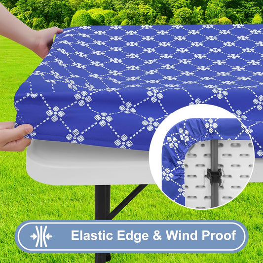 Rectangle Vinyl Table Cloth, Elastic Fitted Tablecloth with Flannel Backing, Waterproof Plastic Table Cover Fits 6 Foot Folding Tables for Camping, Indoor and Outdoor (Blue, 30" X 72")