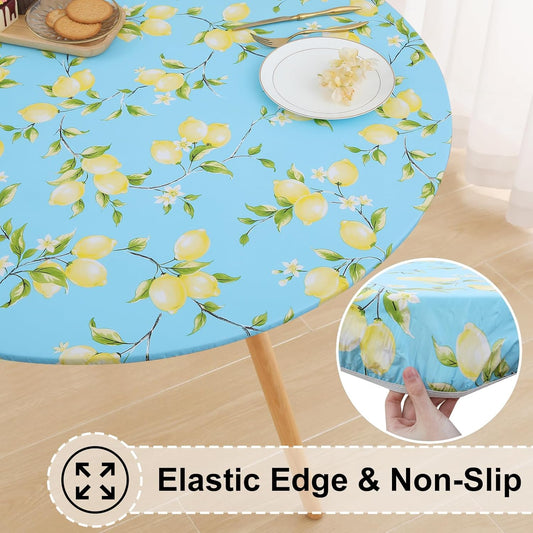 round Fitted Tablecloth with Elastic Edge, 100% Waterproof Oil Proof Plastic Table Cover, Vinyl Flannel Backed Tablecloth Fits 36"-44" round Tables for Dinner, Outdoor, Picnic, Lemon