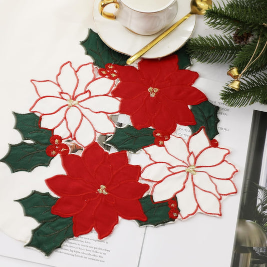 Christmas White Table Runner 13X70 Inches Long, Embroidered Red Poinsettia Flower Christmas Runner for Table, Xmas Dresser Scarves Holiday Parties Kitchen Farmhouse Dinner Decor
